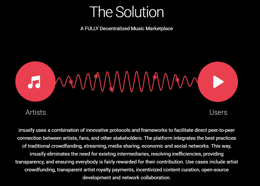 “imusify’s mission is to provide an open-source innovation space for developing new means of music distribution, consumption, and engagement. imusify is building a music smart economy to allow for the direct exchange of value between artists, fans, and other stakeholders, giving our community the power to control the future of the music industry.”