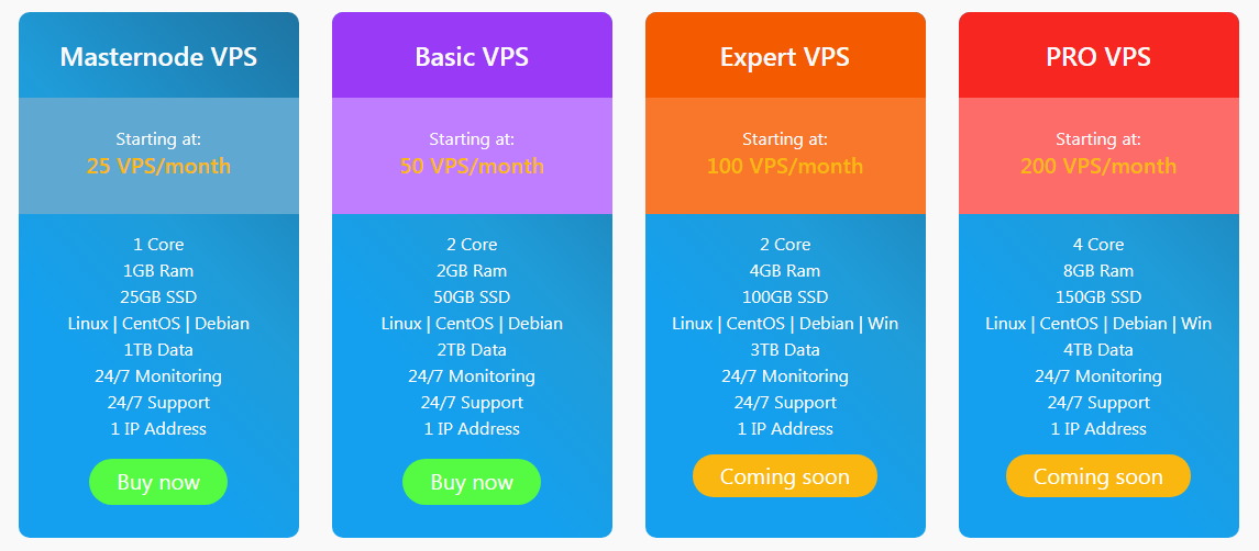 - Low costs in high quality VPS, also if you are a holder of VPS coins you can pay for your services with the profits generated with Staking or Masternodes (If you have one).