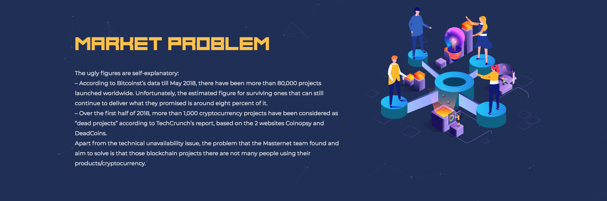 They define the problem is that many blockchain projects have been considered as "dead projects" since there is no community that is strong enough to support them. As stated in their Whitepaper, Bitcoin is the king since it has been there for a decade, having gathered a large number of people supporting its idea.
