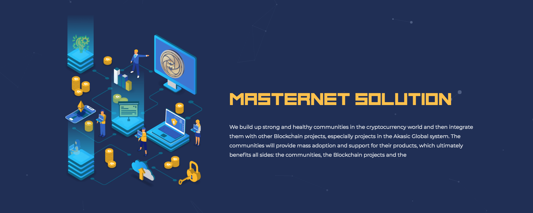 Masternet is a Multi-system Interconnected Financial Platform being the community project built for the Akasic Global project and designed for a greater aim: to integrate with other Blockchain projects in need of real users, catering to everyday’s needs of a huge and prosperous community.