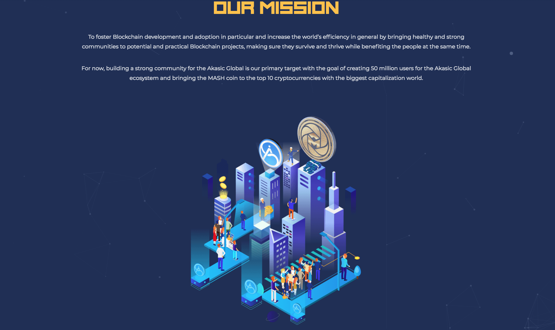 As the first step, building a strong community for the Akasic Global is their primary target with the goal of creating 50 million users for the Akasic Global ecosystem and bringing the MASH coin to the top 10 cryptocurrencies with the biggest capitalization world. In fact, Masternet was originally born from the help of the Akasic Global and meant to be their community building project.