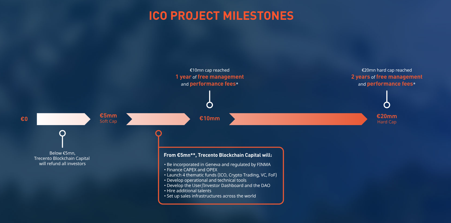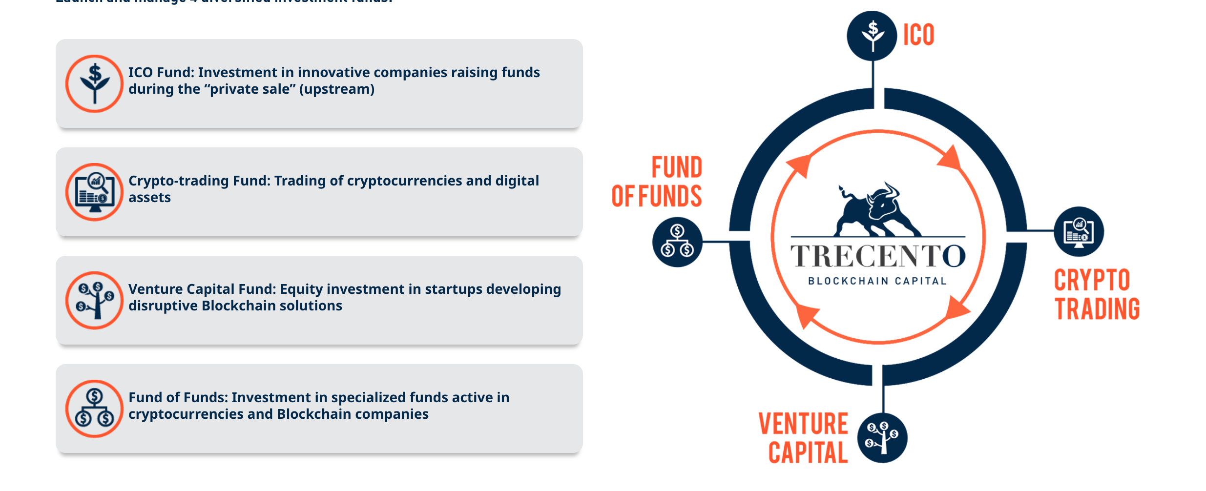 A holistic and user-oriented approach. In order to obtain the best and safest solutions for crypto invests for private and corporate investors, the "Trecento" project provides its previously established funds, experienced services and a developed investment platform. All three will be based on Blockchain technology. Trecento Blockchain Capital will issue 4 thematic funds covering the full investment cycle of Blockchain. The goal is to provide investors with a safe and comprehensive approach to investing.