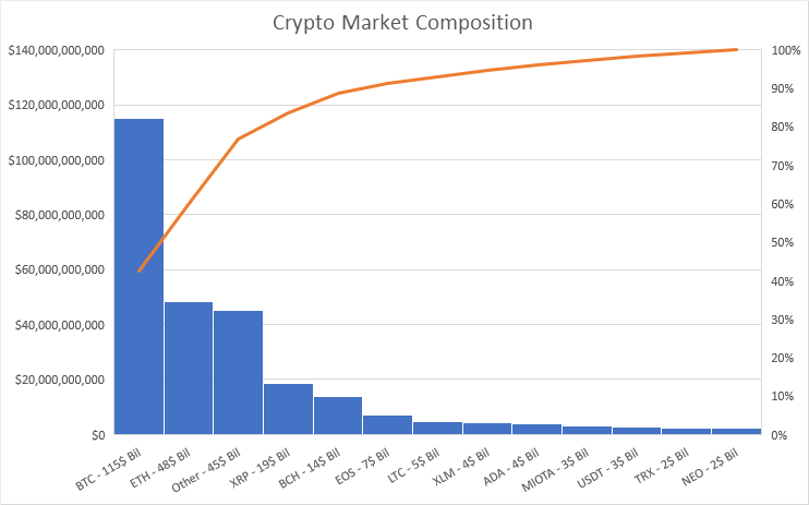 The purpose of this post is to create a visual representation of the cryptocurrency market to better demonstrate its composition. As demonstrated, the top 4 cryptocurrencies (BTC, ETH, XRP & BCH) represent over 71% of the total market cap.