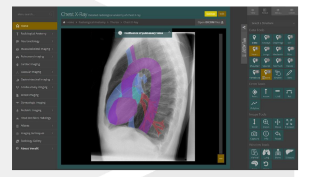 VoxelX platform is stuffed with many tools that enables the medical learner and the radiologist to interact easily with the DICOM-Images. Among these tools are innovative drawing tools that have made it possible to connect and link the structures and diseases on the images with all recognised knowledge resources on the web.