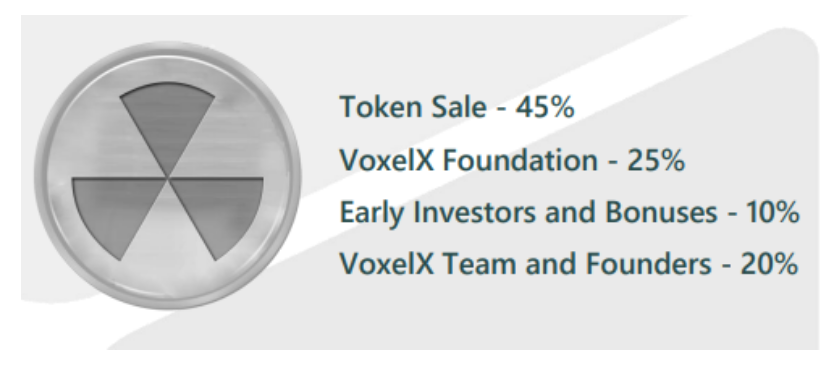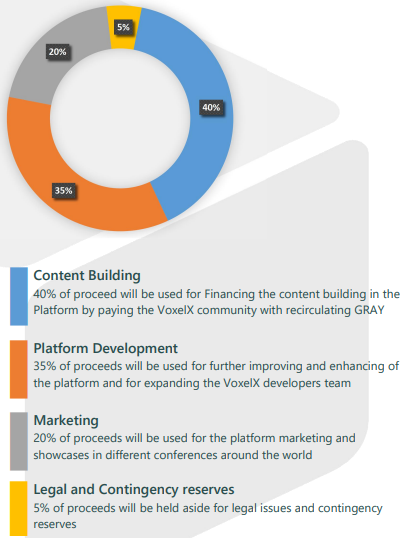 The total supply of VoxelX GRAY tokens that will ever be created is 10,000,000,000 (10 billion). The initial token amount is large in order to set a suitable price for microtransactions which occur on the platform. All GRAY tokens will be generated in a seed block and distributed as follows: