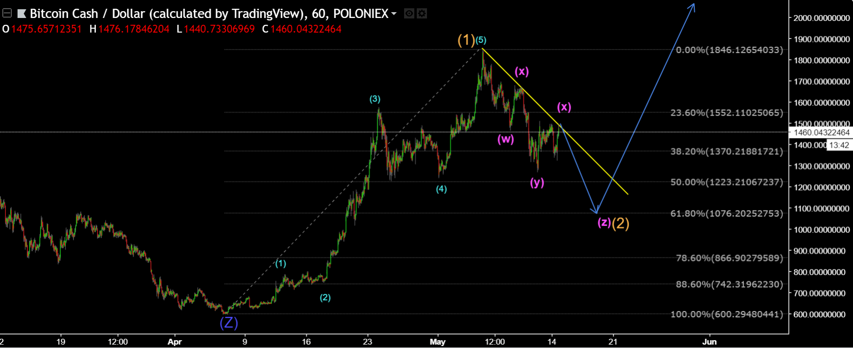 Bitcoin cash with 5 subwaves completed first impulse (1) and started correction in (2) wave. Currently I see simple ABC zigzag and it could be all the correction, so if it breaks the trend line with strong momentum upwards I expect continuation to new historic high in (3) impulsive wave: