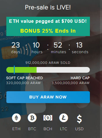 For investments into ARAW a token it is possible to use the following means of payment: ETH, BTC, BCH, LTC, USD. To start investments, it is necessary to press “BUY ARAW Now” then to undergo authorization and to get access to a private office. In a private office all opportunities for investments into ARAW will be given. Also It should be noted that right now you have an opportunity to invest in ARAW with an additional bonus 25%!
