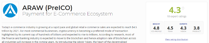 Rating. The ARAW project has very good rating on the majority of the websites which provide rating estimates for ICO projects. For an example I suggest to consider rating from ICO Bench.