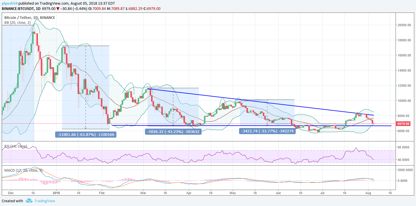 The bitcoin price is down 15% this week following strong gains of 9% last week and 18% the week before that. The coin had been hovering around the $8,000 mark since it first hit the crucial price level on August 24th. The $1,200+ price drop has largely been blamed on the SEC’s rejection of the Winklevoss’ second ETF rejection. On its way down, the price flirted with the $7,800 support level before failing to maintain that level. The bearish pattern has continued all the way down to the $7,000 level.