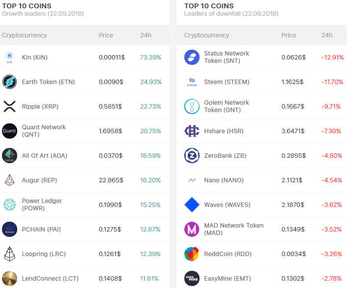The growth and fall of ICO tokens with their changes in 24 hours: