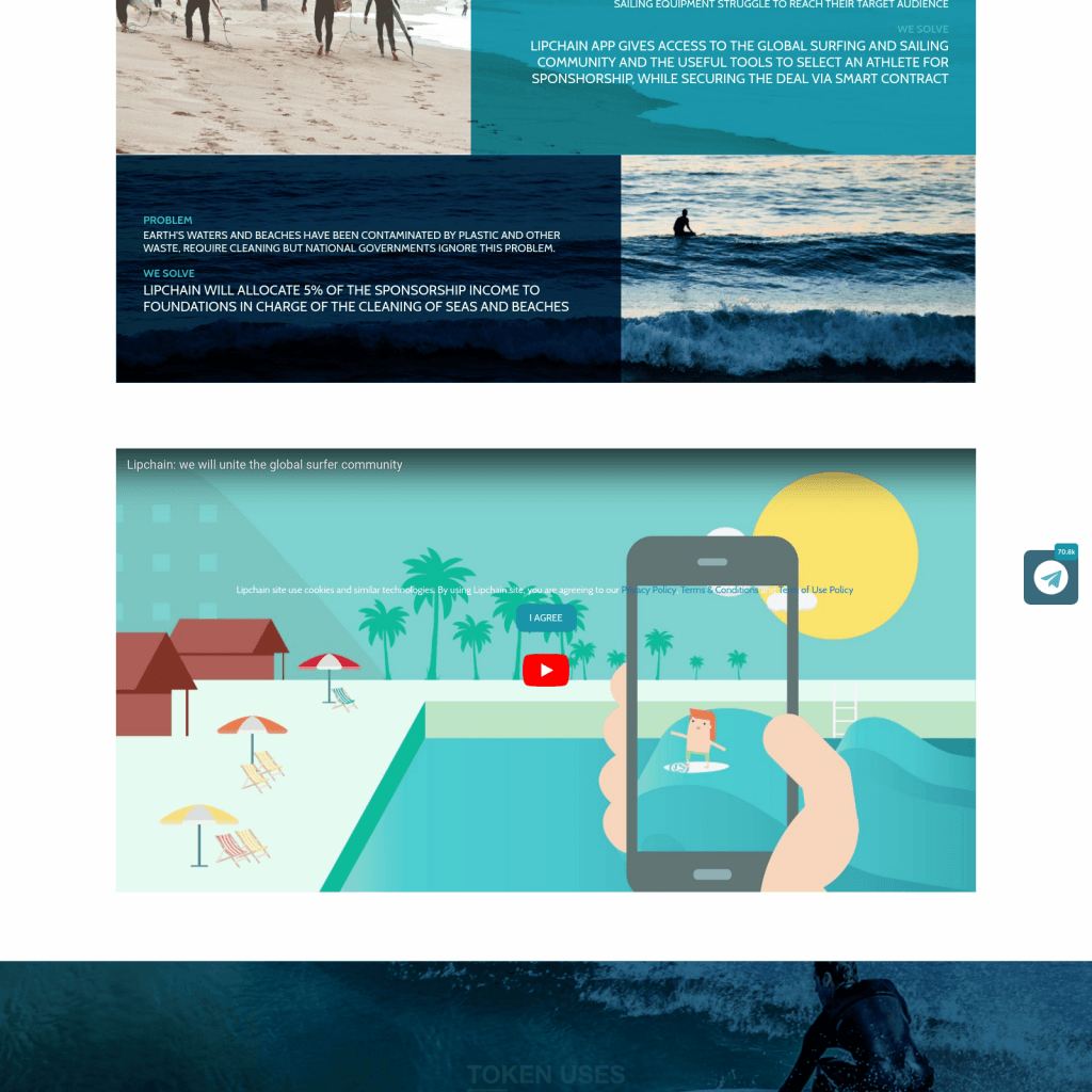 Decentralized ecosystem, providing surfers due to sponsors, competitions and open all year round learning environment. 60 million browsers from around the world can be able to make tokens by merely exercising your favorite sport and content videos and images in the application LipChain. Can turn out to be Champions quicker and at the same period to contribute to the cleaning of the seas. LipChain, the organization, is arranging the building of the internal wave private pools for year-round schooling with following island eco-resort.