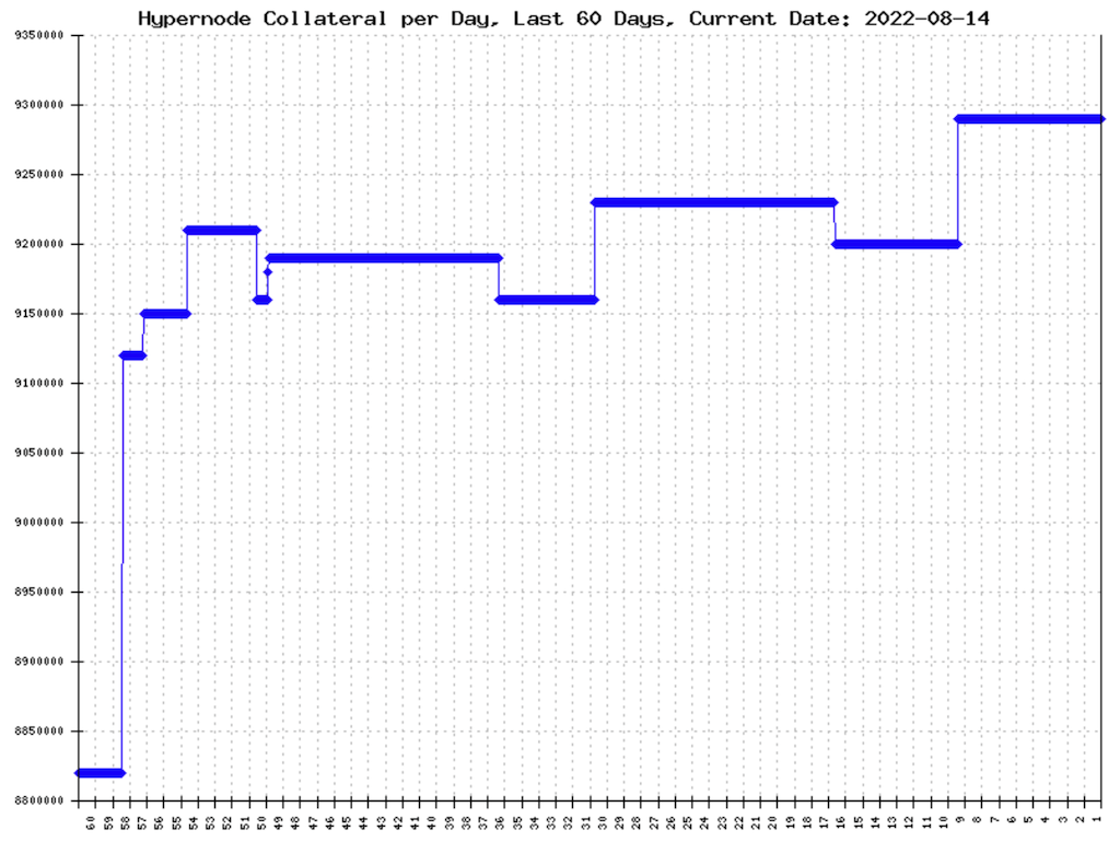 Current Hypernodes ROI is 21.4%, up from 18.6% in July. We count 204 active Hypernodes with a total amount of active collateral of 5,890,000 BIS. That’s a decrease of 27 active nodes since the last report.