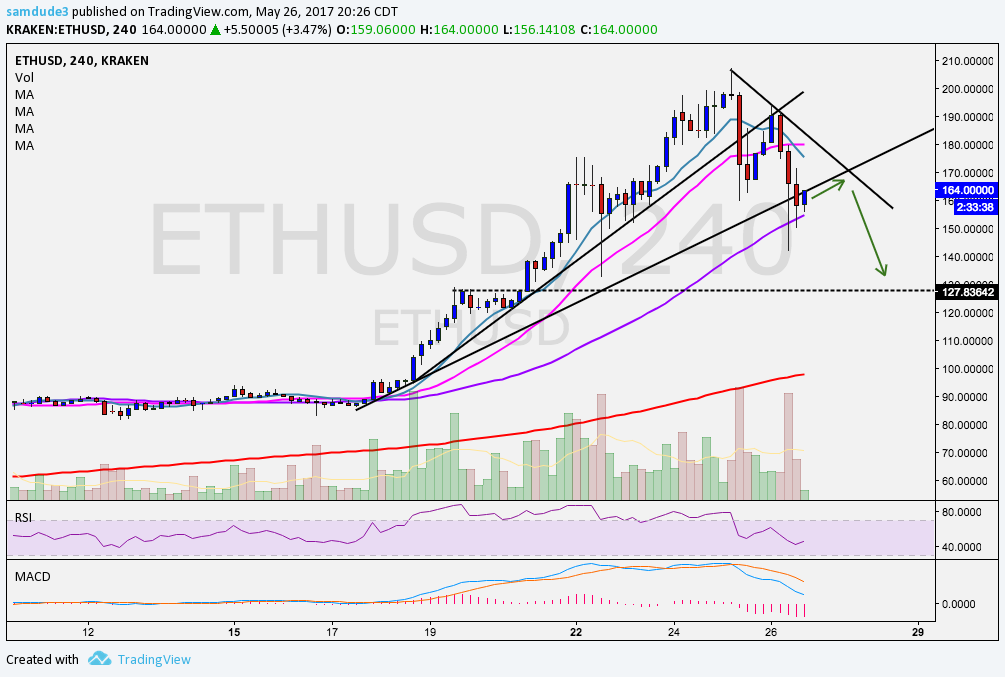 You can see this is a similar situation to Bitcoin where we broke the longer term upward trendline and are forming lower swing highs and lower swing lows. Currently, we are holding the 50 day moving average and finding support which can lead to price fluctuating at this level. There aren't too many clear areas of support until $127.
