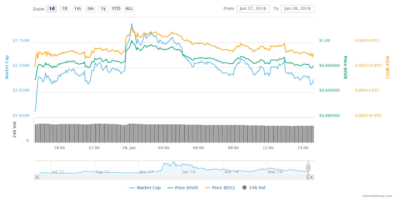 That was 15 hours ago, and the price levelled out again soon afterwards. But at the time of writing IOTA has once again jumped past Tether, while sitting at a unit price of $0.97.