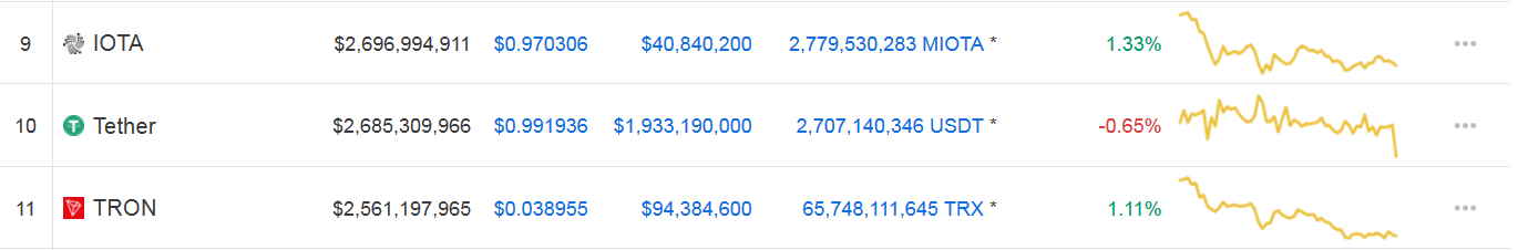 As you can see, Tether’s 0.65% loss was enough to let Tether push past it, with MIOTA’s market value amounting to $2,696,994,991 - just $11 million more than Tether’s.