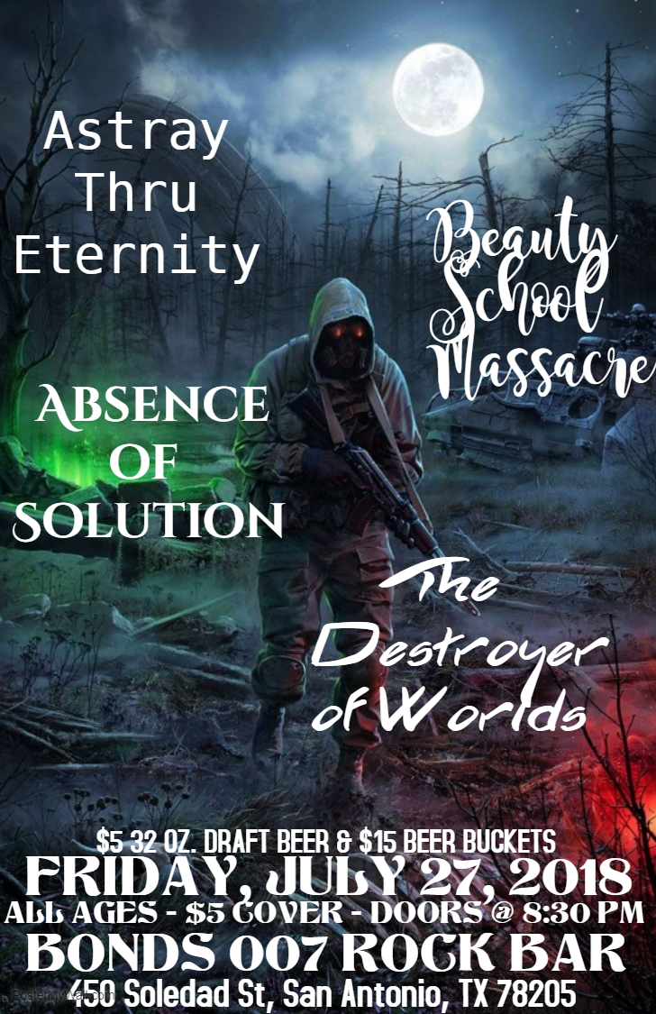 If you get tickets online they all come with a plus one so make sure you bring a guest: https://www.eventbrite.com/e/the-destroyer-of-worlds-beauty-school-massacre-astray-thru-eternity-tickets-47980377601