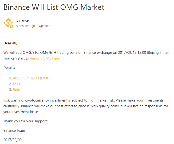 That's right, the recent price hike in OMG in the last couple hours is due to being added on more exchanges. HOP on the pump before it's too late. Binance will be adding OMG at 12:00 Beijing time, which is in 5 minutes!
