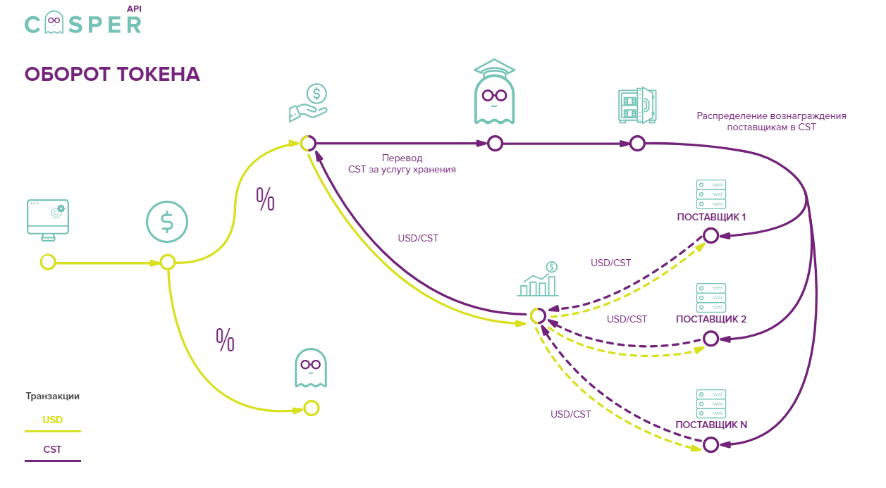 Casper API является децентрализованной платформой для хранения информации. Проект запущен на основе блокчейна и будет работать с использованием всех преимуществ смарт контрактов. Принцип работы прост. Пользователь приходит на платформу и покупает себе место для хранения информации. Далее в работу включаются поставщики места (другими словами люди, которые имеют свободные HDD). Платформа автоматически соединяет этих двух участников системы и происходит процесс сохранения информации.