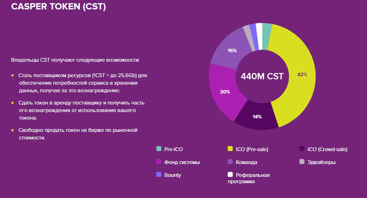 Согласитесь, идея очень интересная. Создание целой экосистемы распределенного хранения данных. Данная платформа позволит не только надежно сохранять информационные данные, но и зарабатывать деньги, путем сдачи в аренду места на своем жестком диске. Проект Casper API находится на высоком уровне готовности и уже сейчас есть MVP и можно протестировать SDK. Команда у проекта отличается высокой степенью профессионализма и опытностью. Сейчас проходит Pre-Sale проекта, в ходе которого можно приобрести токены CST со скидкой. Общее количество токенов составит 440 миллионов.