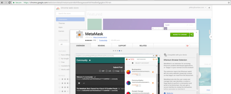 Search Google for “metamask chrome extension” and click the link that begins with https://chrome.google.com. You will be taken to the install page, where you can click “Add to Chrome”.