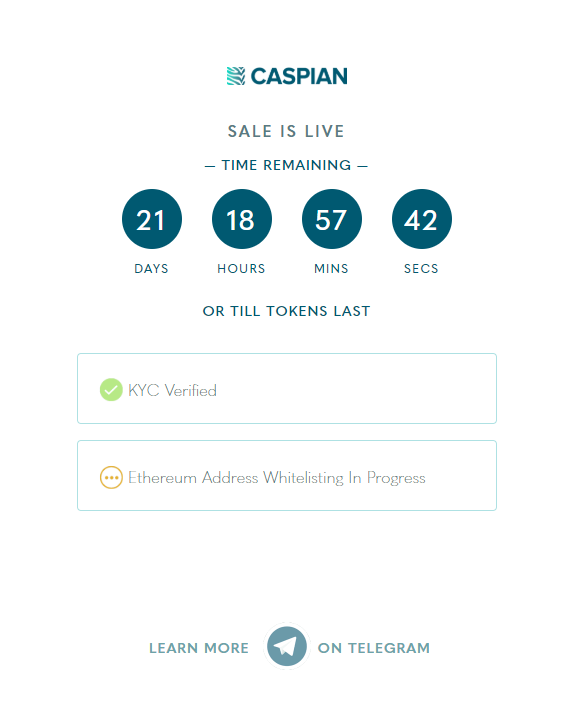 Due to the overwhelming response from the community, whitelisting for the Caspian public token sale has been extended for an additional two weeks and will now conclude on the 10th of October. This is in order to allow everyone enough time to complete the process. Public sale dates have been changed accordingly and will now commence on the 17th of October. More details in our latest Medium post here.