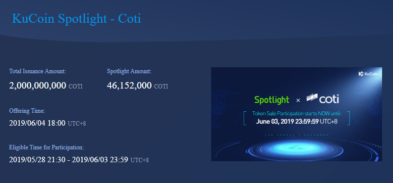 KuCoin would like to inform all their dedicated users that Spotlight page for coti is finally up and running. Kindly visit this page to know more about coti and further instructions and procedures about the upcoming token sale on June 4.