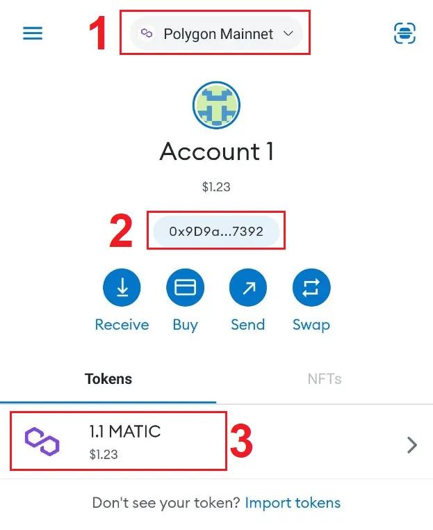 - Here we see the address of our wallet and the option to copy the address. Remember, in order to purchase tokens or perform any transaction through Polygon chain, you need to have Matic on your wallet (which are needed for gas fee). When making a deposit to your MetaMask address, you must choose Polygon chain when sending Matic, or any other currency (USDT, USDC).