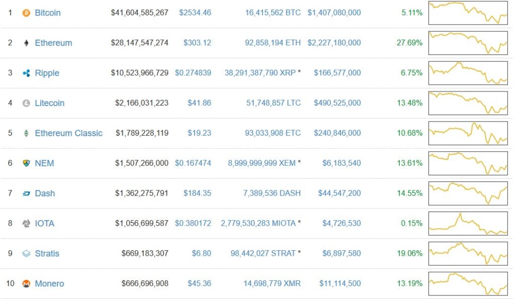 The bitcoin price led the charge, increasing by more than 5% in 24 hours to $2534. This price rally was a welcome change from yesterday, when bitcoin fell well below $2400. The bitcoin price still has some climbing to do if it wants to get back to $3,000, but today has put it on the right track.