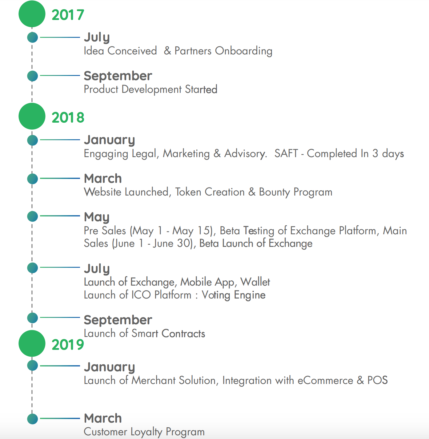 In addition to the above services, CGCX also provides CGCX token utility services to the public for a total of 1 billion CGCX tokens that represent 50% of the total issuance volume of 2 Billion at a price of 1ETH = 8500CGCX tokens. The CGCX Token is a decentralized cryptocurrency based on the standard 20-token protocol ERC. The CGCX Token supports all Ethereum wallets and will be freely transferable on the Ethereum platform. The CGCX token is not a security token with an equity right but a utility token.