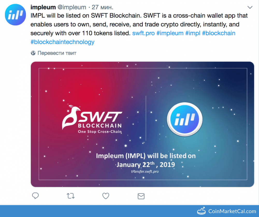 Impleum (IMPL) 22 January 2019 SWFT Listingcoinmarketcal4 (44)in #cryptocurrency • 7 years ago - Impleum (IMPL) 22 January 2019 SWFT Listing IMPL will be listed on SWFT Blockchain. - - https://twitter.com/impleum/status/1083697954148532224 - #news #blockchain #crypto #bitcoin