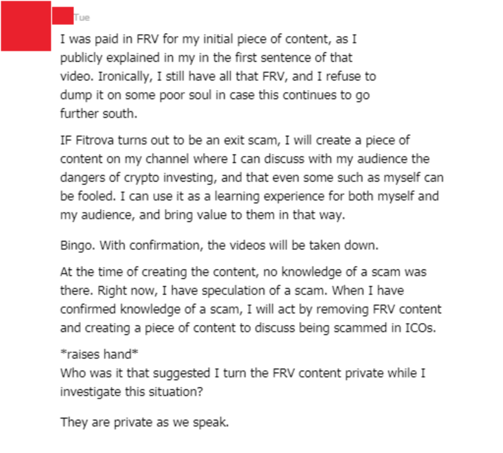 The first content creator graciously offered to remove the Fitrova content to avoid endangering future investors until our investigation had completed. (Disclaimer: Messages were stated over the course of a conversation and have been compiled here to save space). Hopefully the followup video will still be made. This is an ethical and responsible content creator that cares about their viewers.