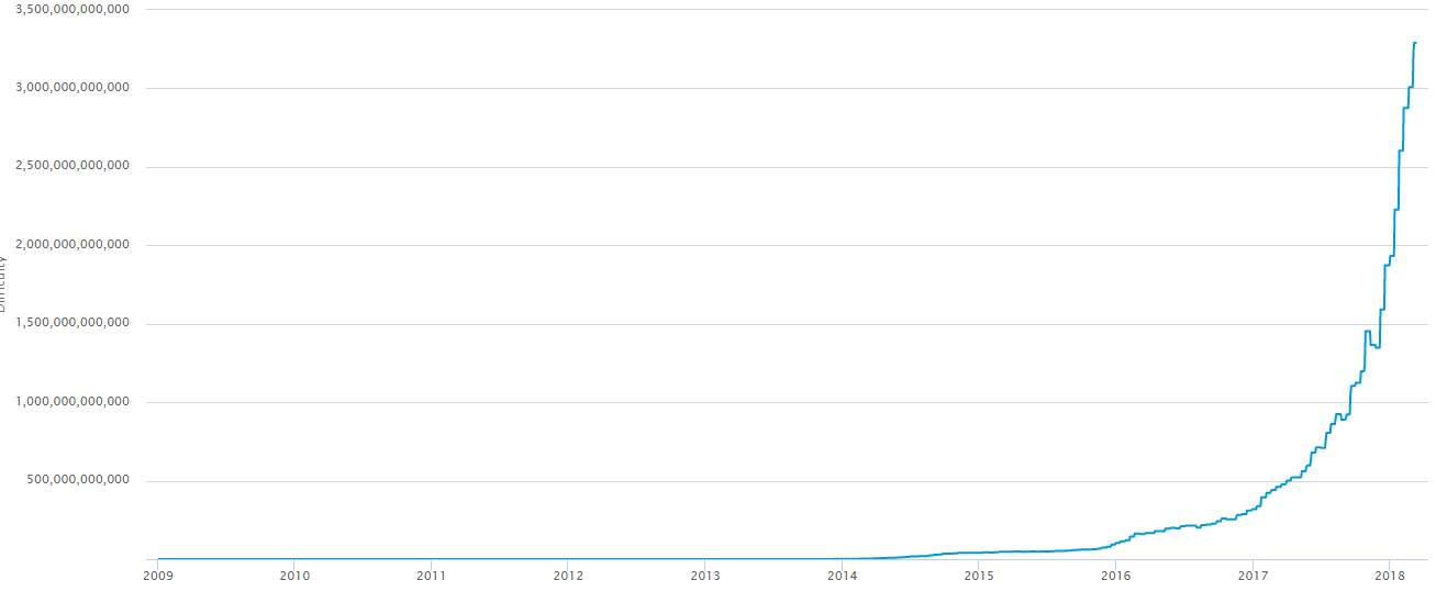 The mining difficulty increased a whopping 700% in 2017, pretty exceptional growth — and has continued unabated in 2018.