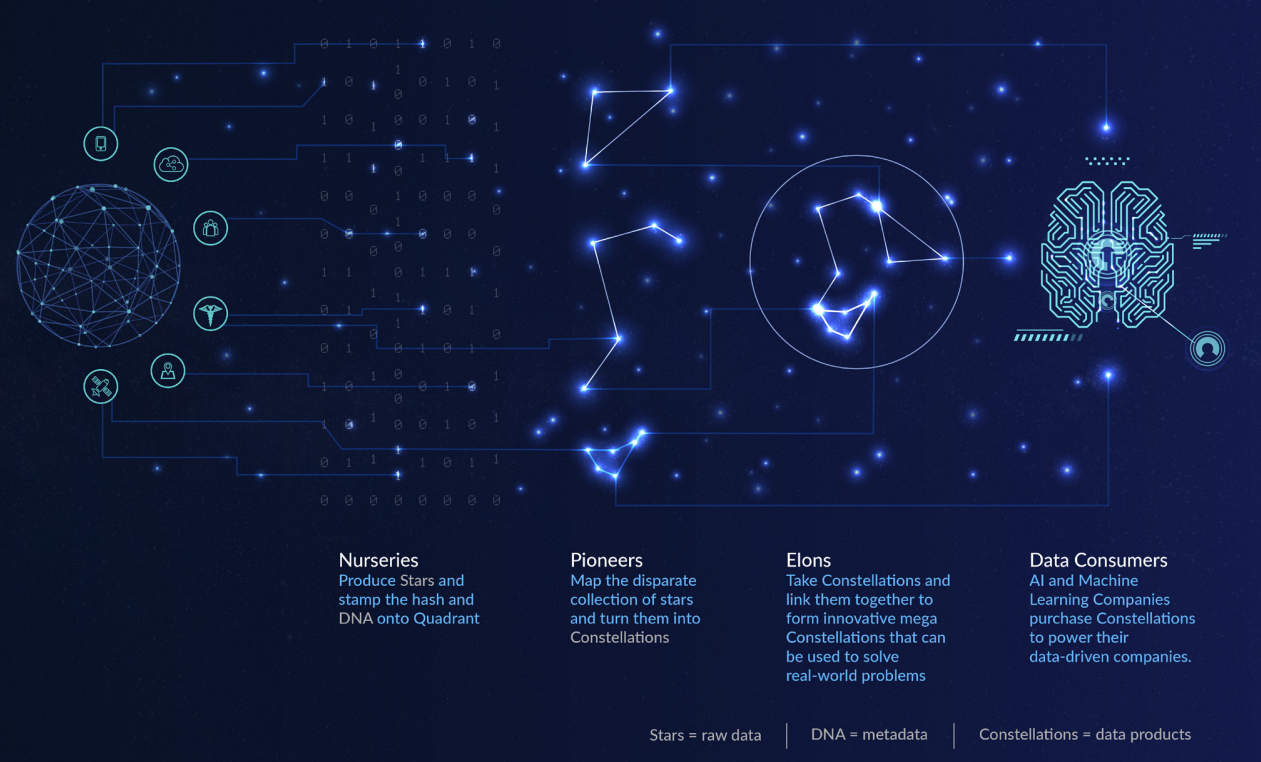 - Nurseries - Atomic Data Producers (ADP) are those who create information and they are the ones who allow the system to expand quantitatively and create stars. We call stars the usual point areas of the night sky. In the Quadrant Protocol system, we can have data with the lowest value. They have nothing in common and for their better application and structuring in large sets of information for use in future projects and developments, we collect these stars and combine them into constellations.