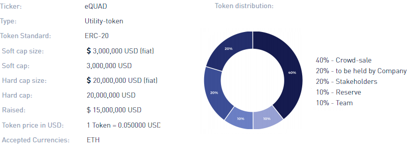 The network will use two different currencies for its protocol: eQuad and QUAD.QUAD is the main network token, while eQuad is a token corresponding to the ERC-20 standard, to Ethereum, which will be available under ICO, and which can be converted to QUAD when the core Quadrant network is launched.