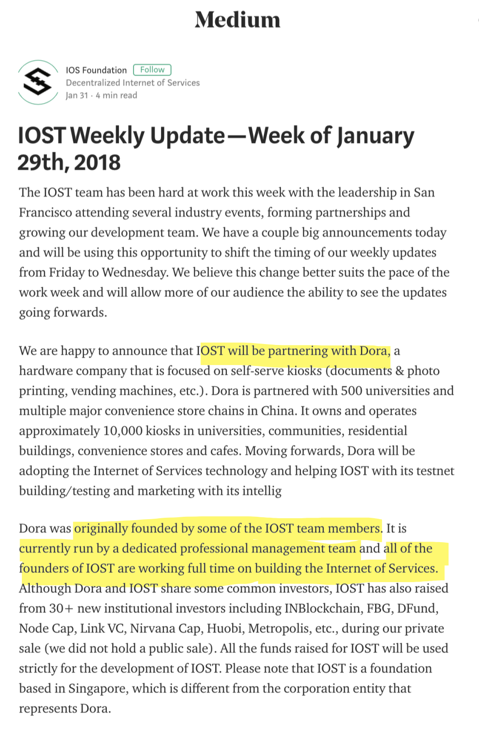 In the IOST Weekly Update Medium post on 31st Jan (it was after they got found out), they announce that IOST will be partnering with Dora. But why would you need IOST technology, or even just blockchain technology for printing machine? isn't the IOST technology for online service providers? Even though they have admitted that Dora was founded by some IOST team member, many things remained questionable.