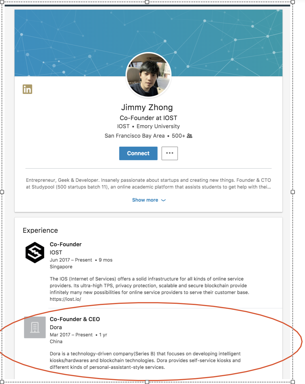 Not only the co-founder of IOST, Jimmy Zhong, is the CEO of Dora. Others core members of the IOST team were found working/ had worked in Dora as well. (BUT, weirdly they did not list this experience on their Linkin profile)