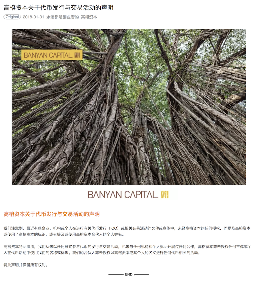 Translation: We have noticed that recently some enterprises, institutions or individuals, are referencing Banyan Capital and its logo, in promotion of an ICO or related document. We are here to clarify that, we have never participate din the issuing or trading any tokens and have never collaborate with any institution nor individuals. Also, Banyan Capital had never authorised any entity to use our name or logo in tokens activities.