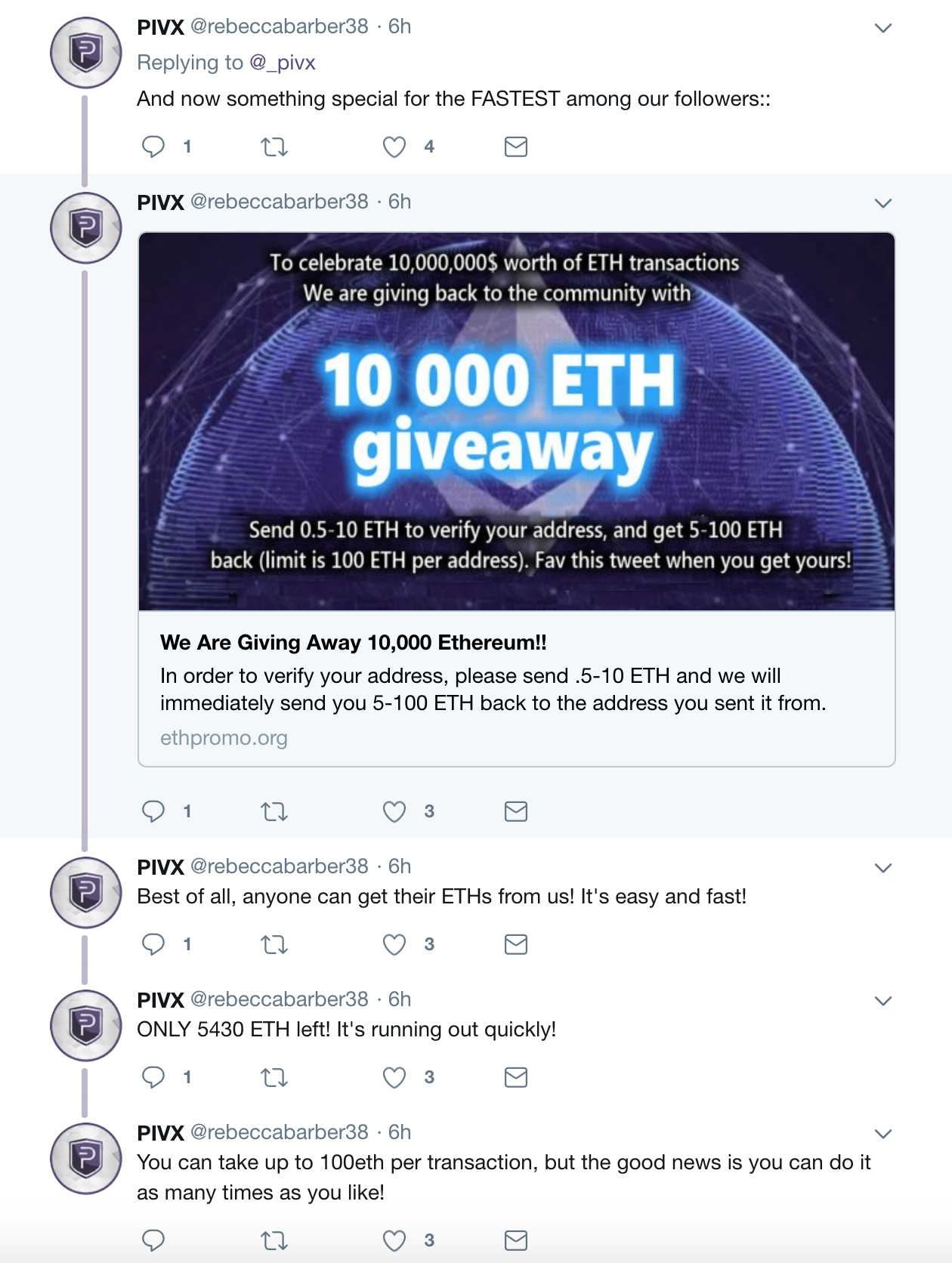 How much is 100 ETH worth today? $525,000 is the answer. Simply by sending over 0.5 ETH (~$375) so the scam post says. In fact, this one found on the PIVX Twitter stream even says that you can send over ETH as may times as you like and earn "up to 100eth per transaction" in return. Again, think about the reality of this promise. By doing several transactions, you could make millions through this scheme. I mean come on.