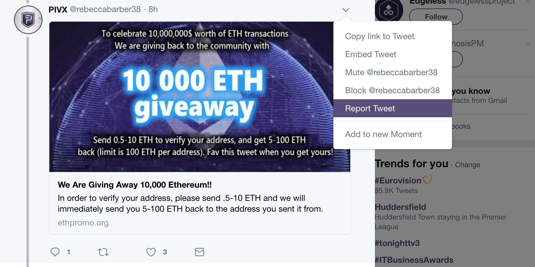 OK so if you've been around in crytoland for a while you've undoubtedly seen these Twitter ETH giveaway scam posts doing the rounds. You know the ones I'm talking about, they have become ubiquitous in Twitter. The scammers latch onto a post from a legit Twitter account, then they post replies saying "To celebrate X Y or Z, we are giving away XXXXXX ETHs"