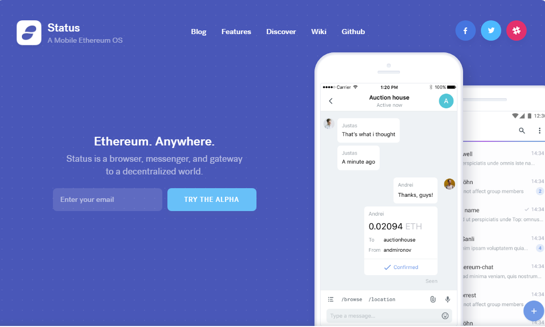 Status will be a messaging platform modeled after the popular Chinese mobile app, WeChat, which had 889 million users at the end of 2016. Status aims to create a level, open marketplace driven by socio-economic incentives where users control their information and how they share it.