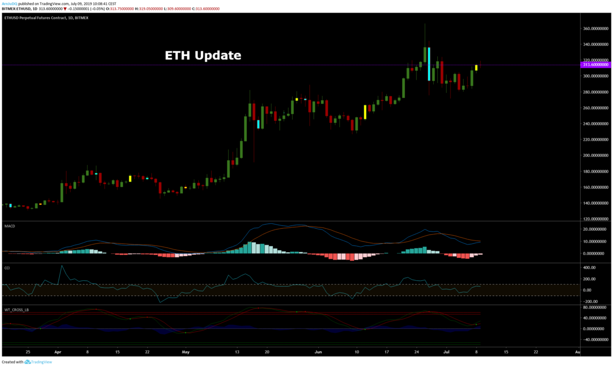 ETH has been evolving above $300 for 2 sessions with a positive daily technical situation. Indeed, the WaveTrends and the CCI are bullish while the MACD is about to cross.