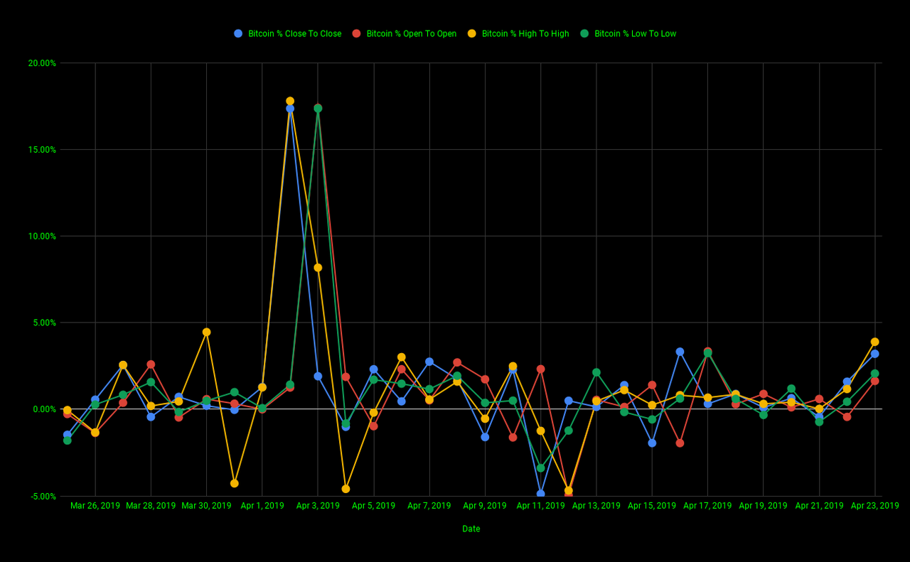 The chart below gives us a look at Bitcoin's % increase/decrease open to open (red line), % increase/decrease high to high (yellow line), % increase/decrease low to low (green line), and % increase/decrease close to close (blue line) for the past 30 days.