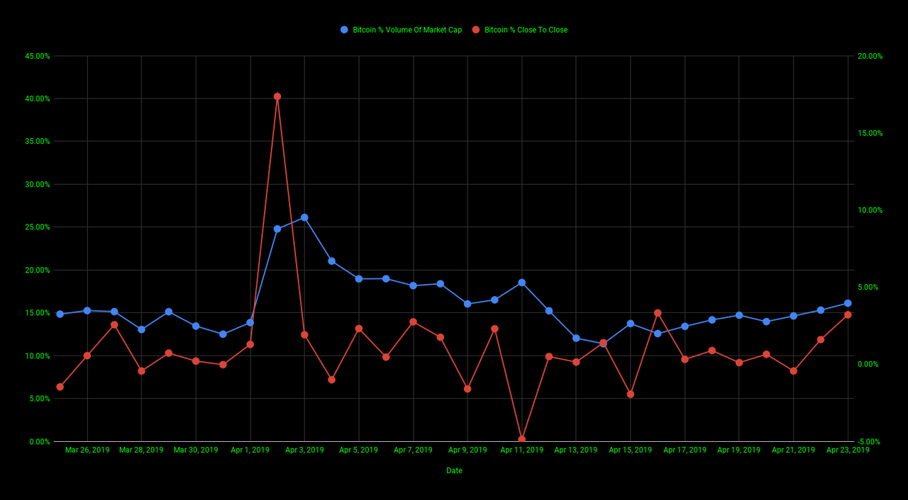 The chart below gives us a look at Bitcoin's % volume of market cap (blue line) and Bitcoin's % increase/decrease close to close (red line) for the past 30 days.