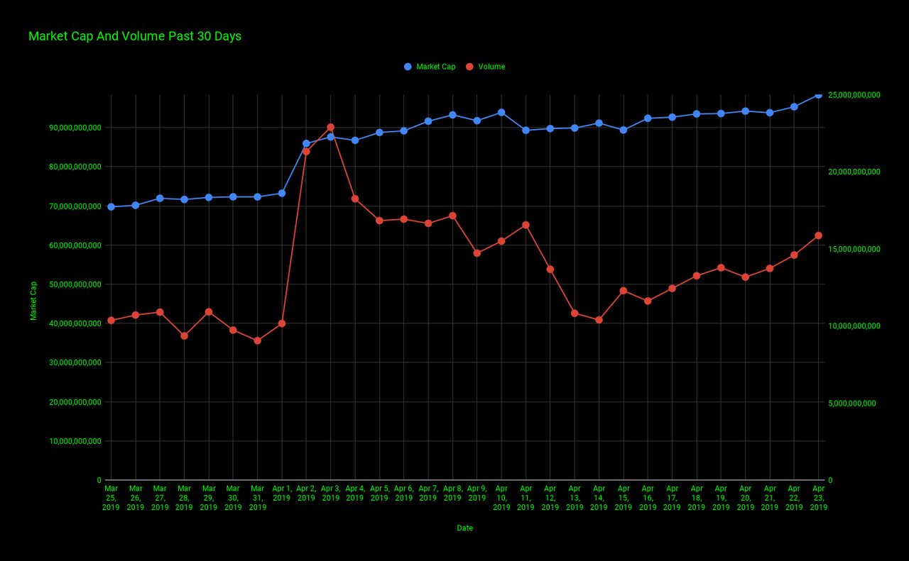 The chart below gives us a look at Bitcoin's marketcap (blue line) and Bitcoin's volume(red line) for the past 30 days.
