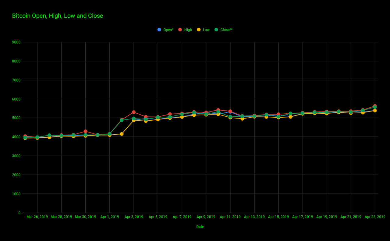 The chart below gives us a look at Bitcoin's open (blue line), high (red line), low (yellow line), and close (green line) for the past 30 days.