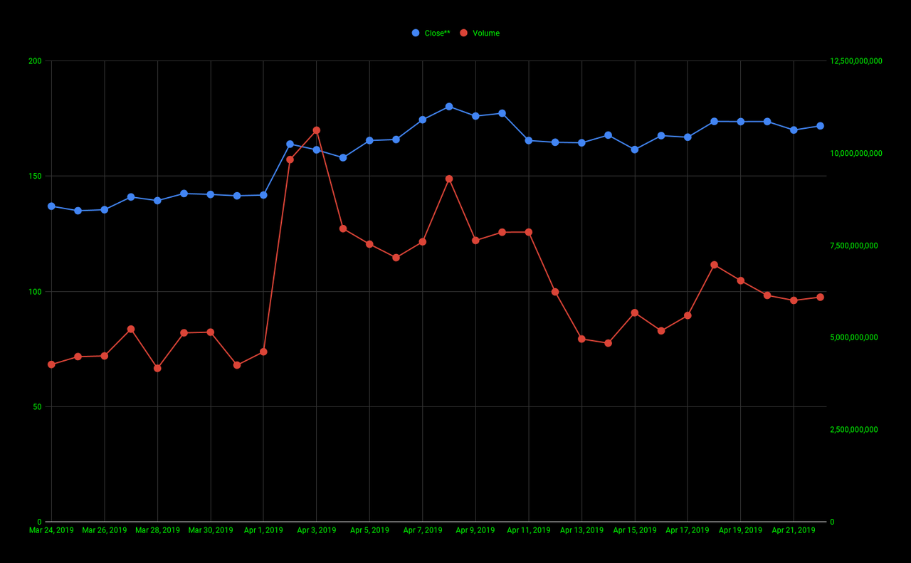The chart below gives us a look at Ethereum's closing price (blue line) and Ethereum's volume (red line) for the past 30 days.