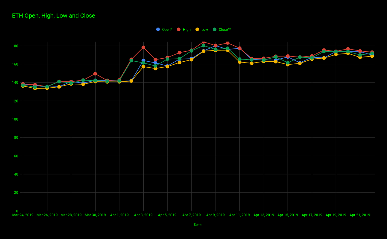 The chart below gives us a look at Ethereum's open (blue line), high (red line), low (yellow line), and close (green line) for the past 30 days.
