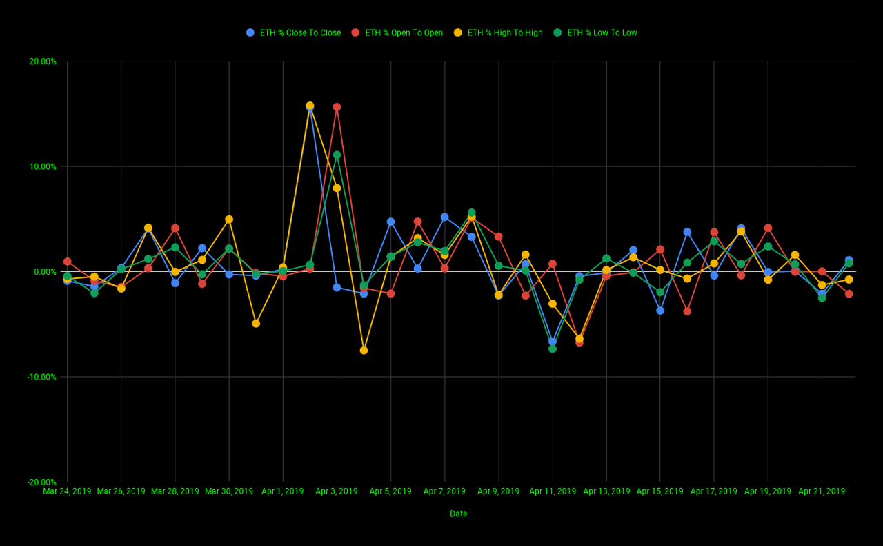 The chart below gives us a look at Ethereum's % increase/decrease open to open (red line), % increase/decrease high to high (yellow line), % increase/decrease low to low (green line), and % increase/decrease close to close (blue line) for the past 30 days.