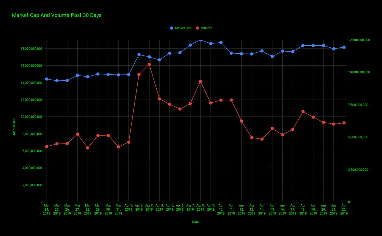 The chart below gives us a look at Ethereum's marketcap (blue line) and Ethereum's volume(red line) for the past 30 days.