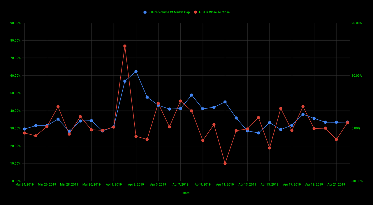 The chart below gives us a look at Ethereum's % volume of market cap (blue line) and Ethereum's % increase/decrease close to close (red line) for the past 30 days.
